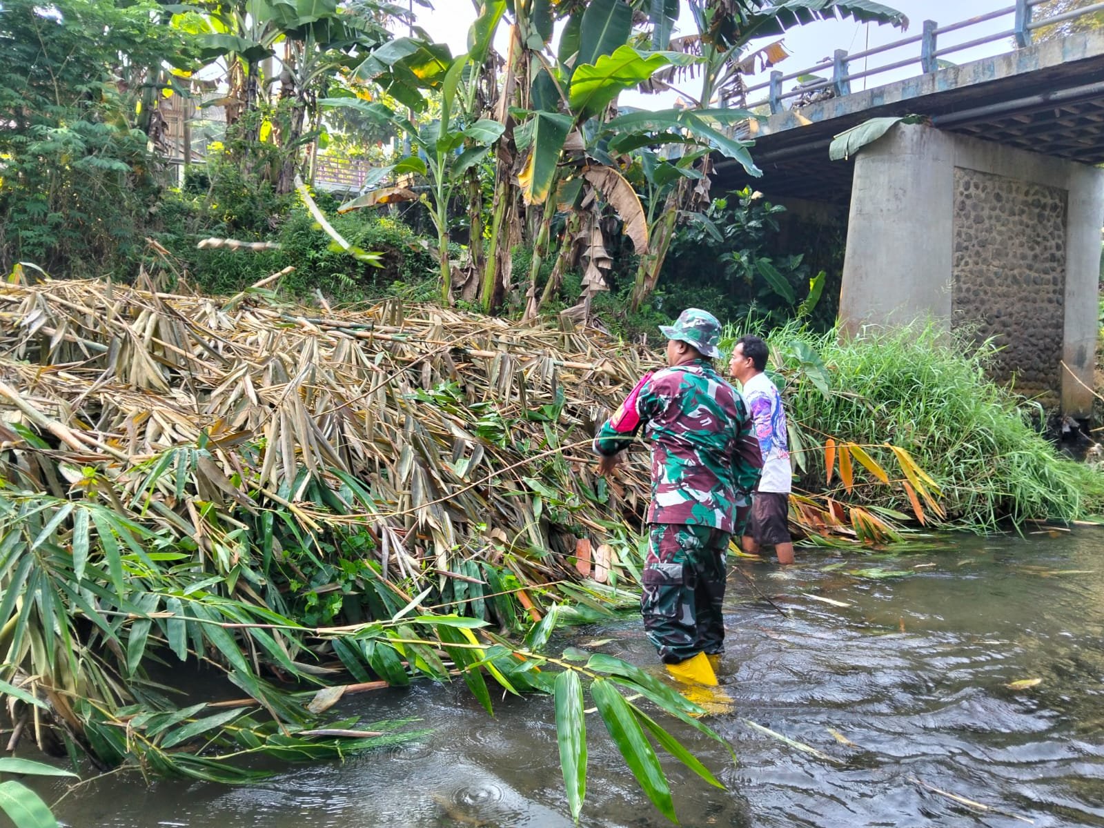 Lumajang, Dalam upaya menjaga kebersihan lingkungan dan mencegah potensi bencana akibat sampah yang menumpuk, Babinsa Tempursari Koramil 0821-18/Tempursari Peltu Dwi Hasim bersama elemen masyarakat melaksanakan kegiatan pembersihan sampah di bawah jembatan Sungai Rawaan yang terletak di Dusun Krajan, Desa Tempursari, Kecamatan Tempursari, Kabupaten Lumajang, Jawa Timur, pada Rabu (30/4/2025).