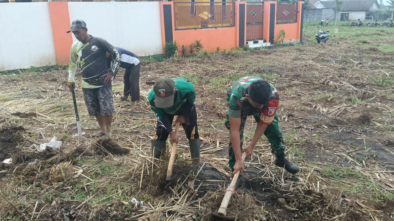 Lumajang, Demi mendukung kelancaran rencana lomba pacuan kuda, Babinsa Bodang Koramil 0821-20/Padang, Serda Lukman Subki, bersama warga melaksanakan kerja bakti pembersihan dan pemerataan area lahan di Dusun Kayu Gedang RT 006 RW 002 Desa Bodang, Kecamatan Padang, Kabupaten Lumajang, Jawa Timur, pada Senin (14/7/2025).