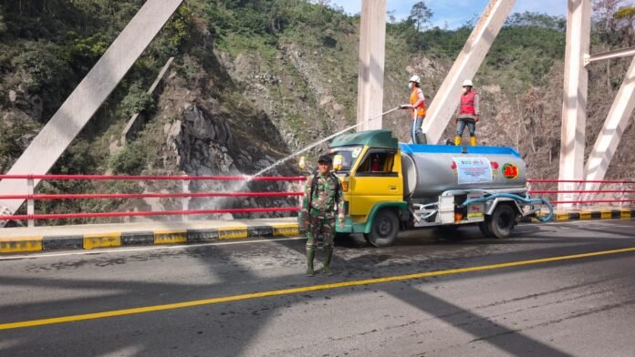 “Kami memastikan area tetap steril selama proses penyemprotan berlangsung. Ini demi keselamatan petugas PU dan masyarakat karena kondisi jembatan sangat sensitif terhadap beban dan aktivitas berlebih,” ujarnya.