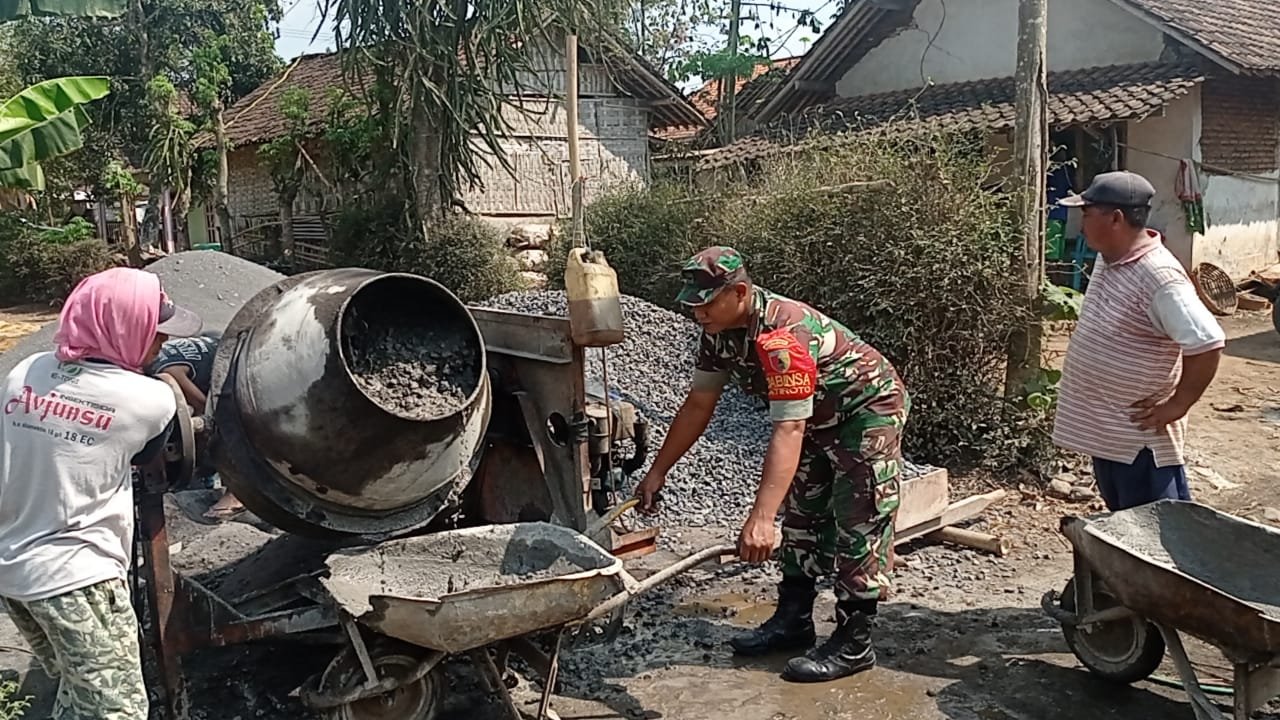 Lumajang, Dalam upaya mendukung pembangunan infrastruktur desa, Babinsa Jatiroto Koramil 0821-12/Jatiroto, Sertu Ahmad Agus Budi Santoso, bersama warga masyarakat melaksanakan kerja bakti pengecoran jalan rabat beton di Dusun Kotokan RT 003 RW 005, Desa Jatiroto, Kecamatan Jatiroto, Kabupaten Lumajang, pada Senin (13/10/2025).