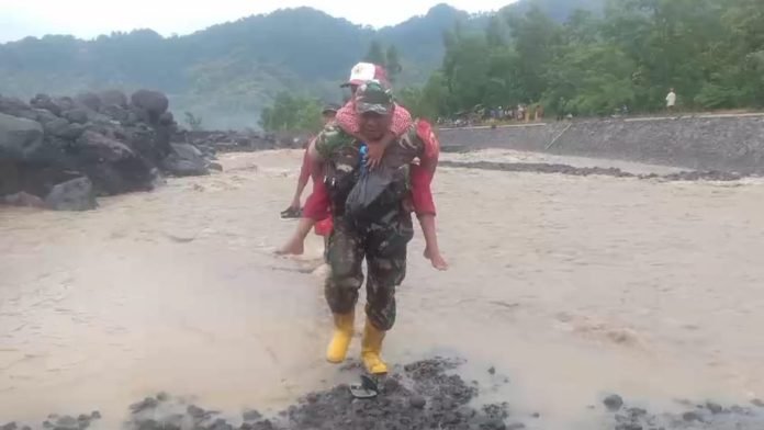 Dalam upaya memberikan bantuan dan dukungan kepada masyarakat yang terdampak, Babinsa Jugosari Koramil 0821/09 Candipuro Serka Novi Wahyu Santoso, terlibat langsung dalam upaya solidaritas kemanusiaan dengan memberikan kemudahan anak sekolah dalam menyebrang sungai tersebut..