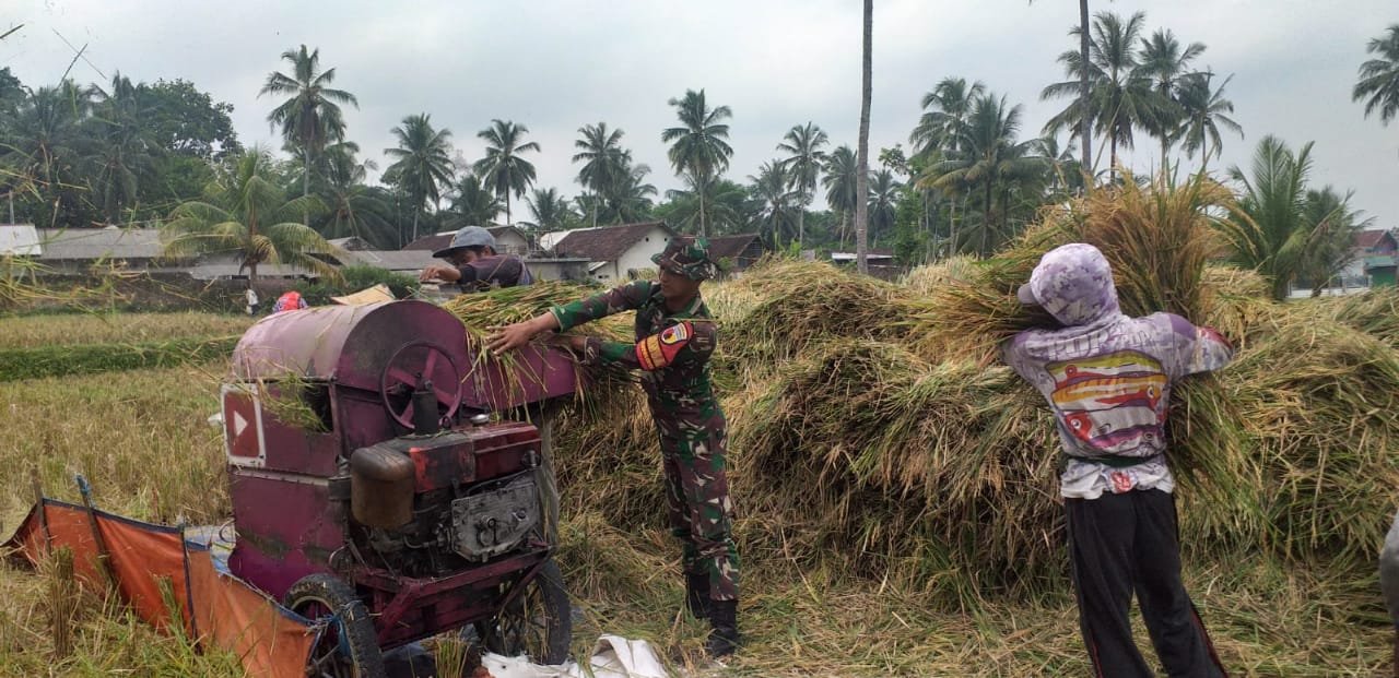 Lumajang, Babinsa Kloposawit koramil 0821/09 Candipro Serda Moh. Dedik Indra Irawan, melaksanakan pendampingan dalam proses panen padi di lahan sawah seluas 0.4 hektar milik Bu. Saitun, anggota kelompok tani Jaya Makmur, di Dusun Jurang Geger Desa Kloposawit Kecamatan Candipuro Kabupaten Lumajang, Jawa Timur, pada Rabu (15/5/024).