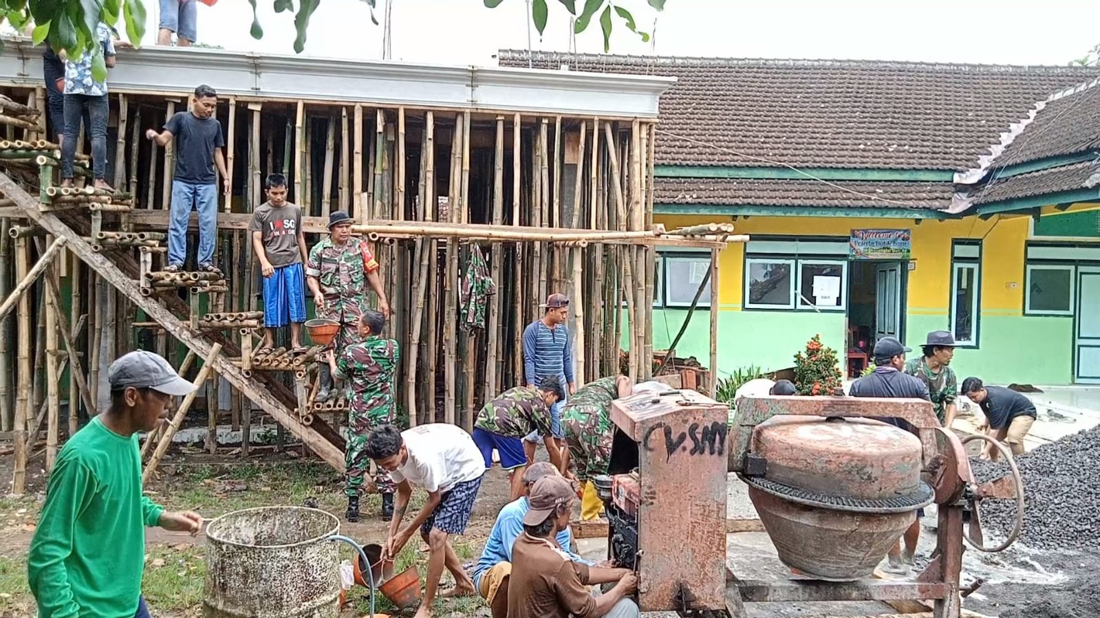 Lumajang, Babinsa Mangunsari Koramil 0821/15 Tekung Sertu Romelan bersama warga melaksanakan karya bakti pengecoran bangunan Madrasah Ibtidaiyah Roudhotul Qur'an di Dusun Tegalsari RT 009 RW 005 Desa Mangunsari Kecamatan Tekung Kabupaten Lumajang, Jawa Timur, Sabtu (3/2/2024).