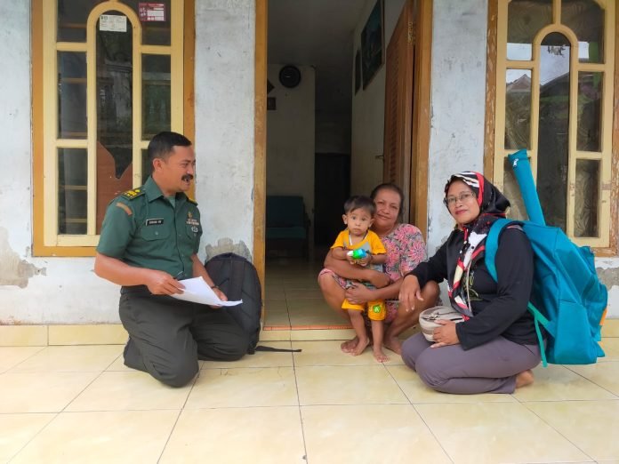 Lumajang, Peduli Kesehatan Balita, Babinsa Tamanayu Koramil 0821/14 Pronojiwo Peltu Danang Widiatmoko, melaksanakan pendampingan kepada Bidan Desa yang melibatkan kader PKK, dalam kegiatan kunjungan kepada balita yang masuk dalam kategori rawan stunting, di Dusun Krajan Desa Tamanayu Kecamatan Pronojiwo Kabupaten Lumajang, Jawa Timur, Selasa (5/2/2024).