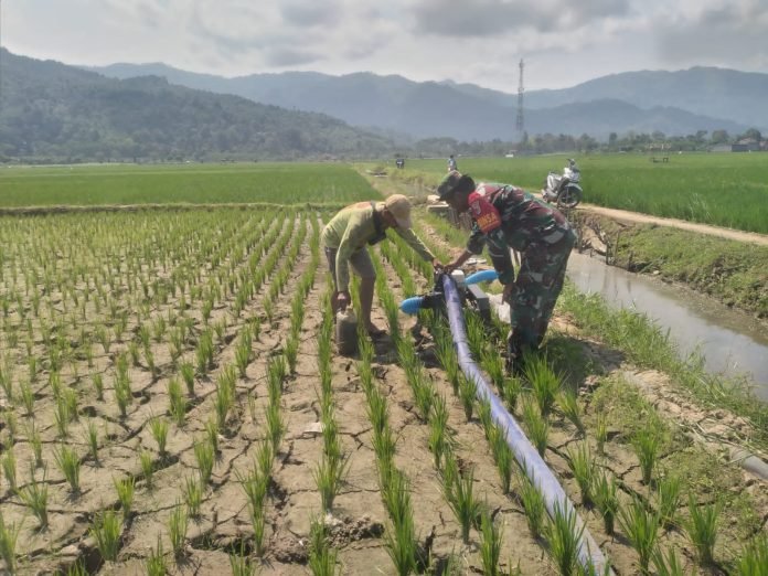 Lumajang, Dalam upaya mengatasi masalah kekeringan yang melanda lahan pertanian di Kecamatan Tempursari, Babinsa Tempursari Koramil 0821/18 Tempursari, Peltu Dwi Hasim As'ari, melaksanakan kegiatan pemanfaatan mesin pompa air bantuan dari Kementerian Pertanian, Langkah tersebut diambil sebagai respons atas laporan anggota kelompok tani mengenai kekeringan yang mengancam lahan seluas 27 hektar, di kawasan Gapoktan Karya Tani II, milik Bapak Sujatmiko, di Dusun Krajan Desa Tempursari Kecamatan Tempursari Kabupaten Lumajang, Kamis (1/8/2024).