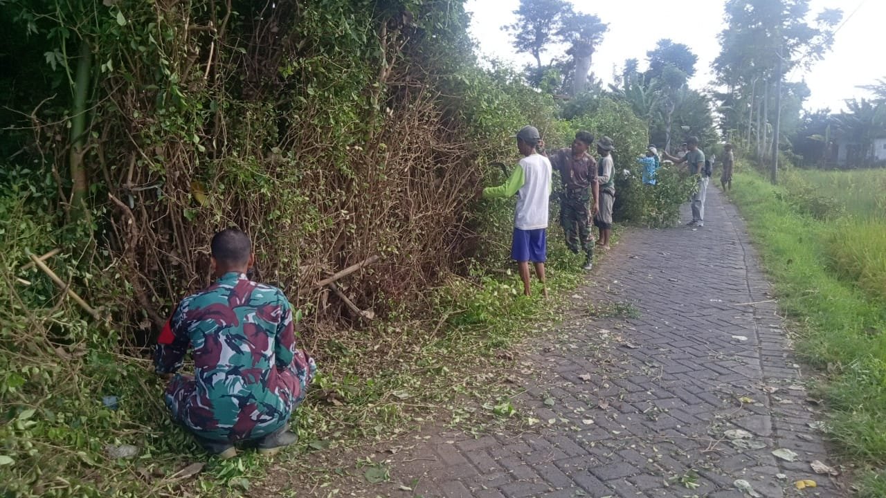 Lumajang, Babinsa Krai Koramil 0821/11 Yosowilangun Serka Sugeng Agus Wiyono, turut serta kegiatan kerja bakti bersama warga dalam upaya membersihkan ruas kanan dan kiri jalan sepanjang 150 meter di Dusun Kebonan, Desa Krai, Kecamatan Yosowilangun, Kabupaten Lumajang, Jawa Timur. Kegiatan ini dilaksanakan pada Minggu (5/5/2024).