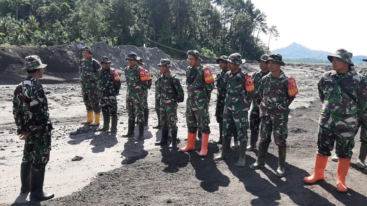 Apel dilakukan tepat di area yang sebelumnya dilanda material banjir lahar dingin, sebagai bentuk pengecekan kekuatan personel sekaligus penyelarasan tugas lapangan. Kehadiran Peltu Baidlowi Abdullah di tengah medan terdampak menunjukkan bahwa TNI tidak hanya bekerja dari pos komando, tetapi turun langsung memastikan setiap unsur siap menghadapi dinamika situasi di lapangan.