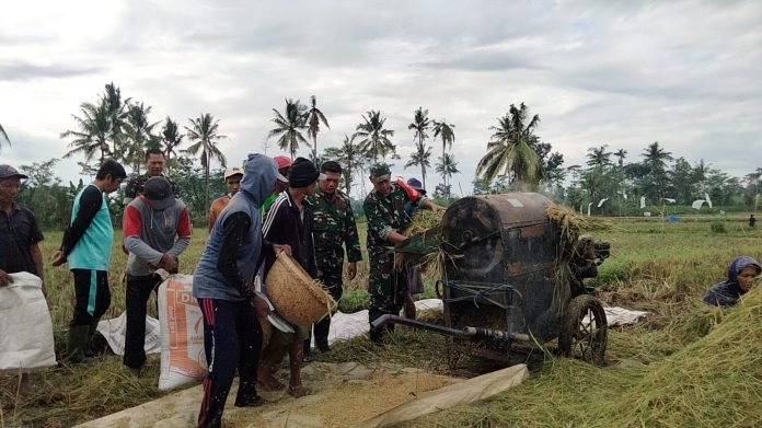 Lumajang, Babinsa Barat Koramil 0821-20/Padang, Serda Mohammad Sholeh Ridwan, melaksanakan pendampingan Serapan Gabah (Sergap) pada kegiatan panen padi milik Kelompok Tani (Poktan) Indah Jaya di Dusun Krajan RT 001 RW 001, Desa Barat, Kecamatan Padang, Kabupaten Lumajang, Jawa Timur, pada Jumat (11/4/2025).