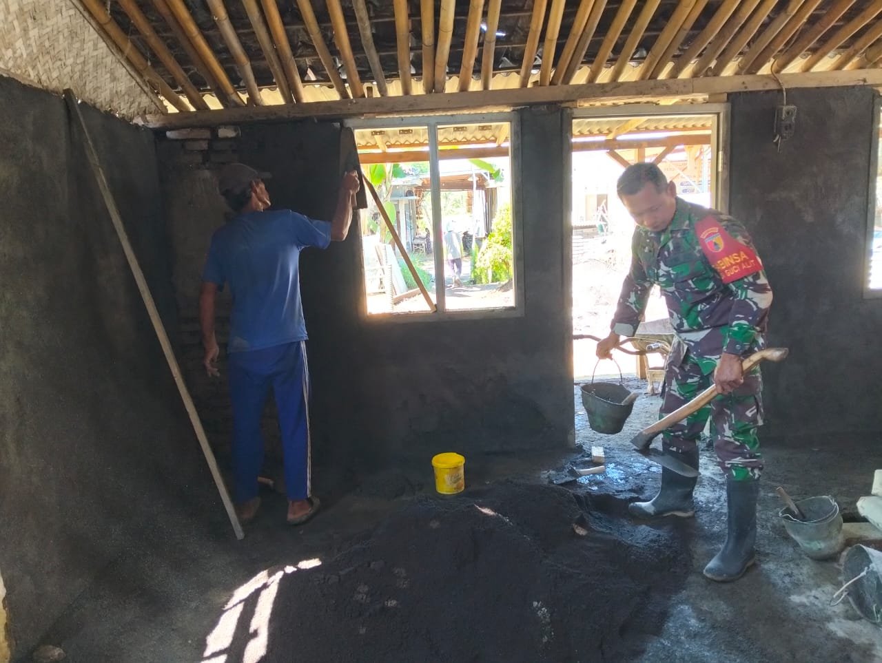 Kegiatan renovasi rumah tersebut dilakukan secara swadaya oleh masyarakat setempat dengan semangat gotong royong yang masih kuat terjaga di lingkungan pedesaan. Dalam kegiatan tersebut, Babinsa turut bergabung bersama warga untuk membantu pengerjaan bagian dinding dan atap rumah yang sudah mengalami kerusakan.