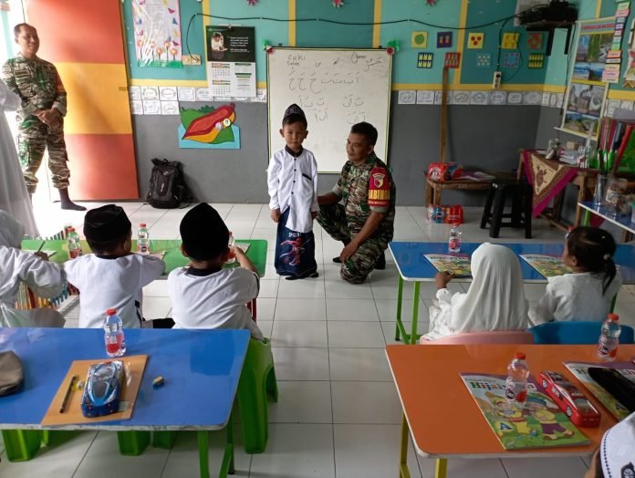 Lumajang – Babinsa Krasak Posramil 0821-05/Kedungjajang, Serka Rinto Harahap, memberikan Wasbang dan motivasi belajar dalam kegiatan wawasan kebangsaan (wasbang) di Sekolah TK Muslimat Ar Rohman Dusun Krajan, Desa Krasak, Kecamatan Kedungjajang, Kabupaten Lumajang, Jawa Timur, pada Jumat (25/10/2024).
