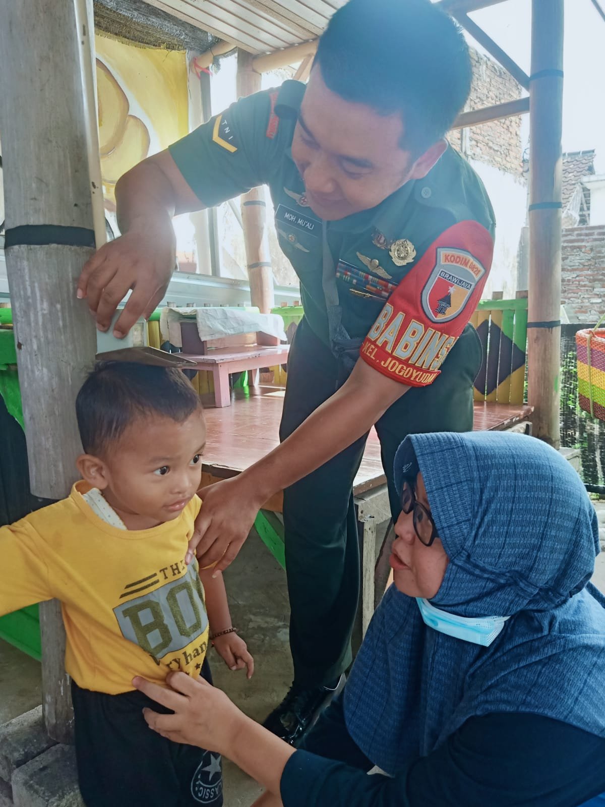 Lumajang, Monitoring Pelayanan kesehatan warga Balita, Babinsa Jogoyudan Koramil 0821/01 Lumajang Serda M. Mu’ali, melaksanakan pendampingan kegiatan Posyandu di Posyandu Beringin RT 001 RW 003 Kelurahan Jogoyudan Kecamatan Lumajang Kabupaten Lumajang, Jawa Timur, Selasa (23/7/2024).