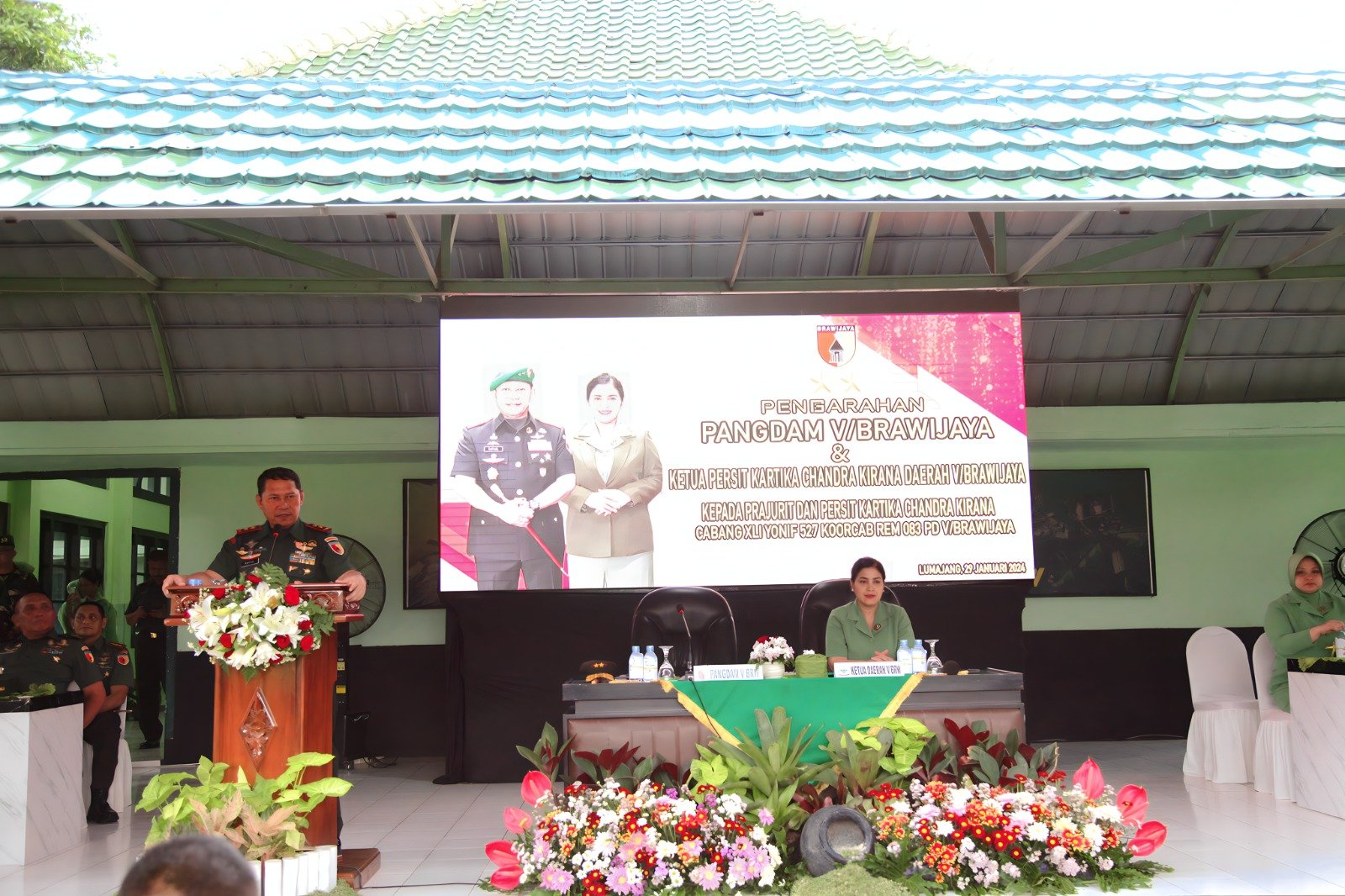 Lumajang, Komandan Kodim 0821/Lumajang Letkol Czi Gunawan Indra Y. T., S.T., M.M., sambut kedatangan Pangdam V/Brawijaya Mayjen TNI Rafael Granada Baay di dampingi Ketua Persit KCK Daerah V/Brawijaya Ny. Lisa Rafael Granada Baay bersama rombongan di Markas Batalyon Infanteri 527/BY Jalan Ahmad Yani Kelurahan Kepuharjo Kabupaten Lumajang, Senin (29/1/2024).