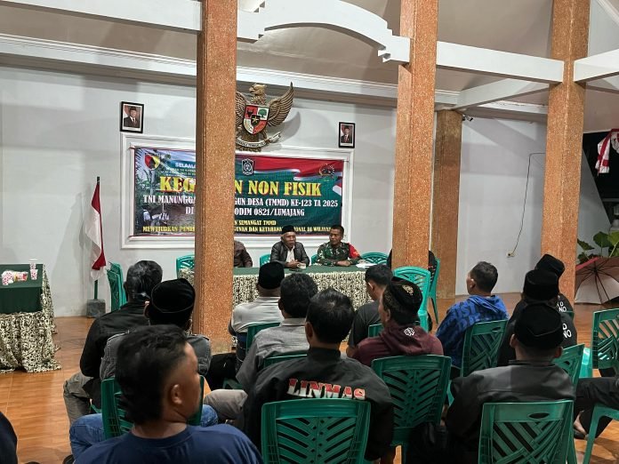 Lumajang, TMMD ke-123, Dalam rangka meningkatkan rasa cinta tanah air dan pemahaman kebangsaan di kalangan masyarakat, Danki SSK TMMD ke-123, Letda Inf Iriayanto, memberikan materi Wawasan Kebangsaan (Wasbang) kepada anggota Satuan Keamanan Desa (SKD) Desa Burno. Kegiatan ini berlangsung di Balai Desa Burno, Kecamatan Senduro, Lumajang, pada Senin (24/2/2025) malam dan dihadiri oleh sekitar 25 peserta.