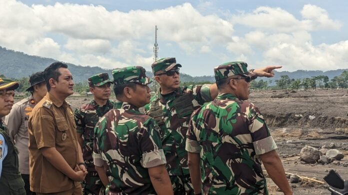 Lumajang, Danrem 083/Baladhika Jaya Kolonel Inf Kohir mendampingi Pangdam V/Brawijaya Mayjen TNI Rudi Saladin dalam peninjauan Posko Tanggap Darurat Bencana erupsi Gunung Semeru di Desa Supiturang, Kecamatan Pronojiwo, Senin (24/11/2025).