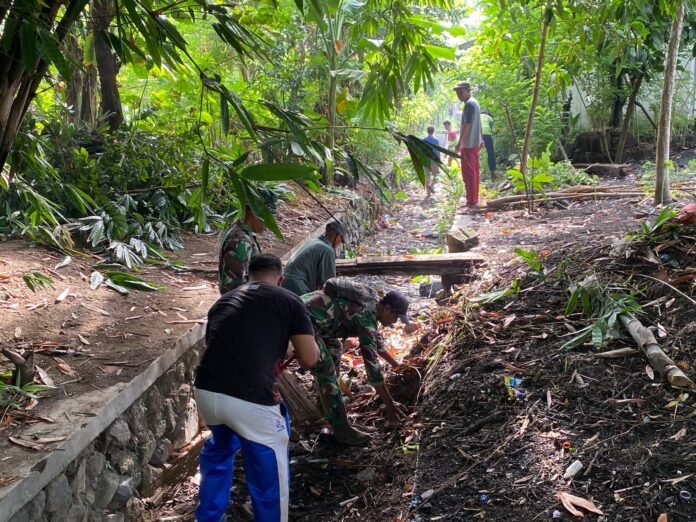 Lumajang, Wujud nyata kepedulian terhadap ketahanan pangan dan kebersamaan antara TNI dan rakyat kembali tampak Babinsa Tempeh Lor Koramil 0821-10/Tempeh, Serda Budi Santoso, bersama warga setempat melaksanakan kerja bakti perbaikan saluran irigasi sepanjang 200 meter di Dusun Tulus Teko 1 dan 2 Desa Tempeh Lor, Kecamatan Tempeh, Kabupaten Lumajang, Jawa Timur, pada Sabtu (1/11/2025)
