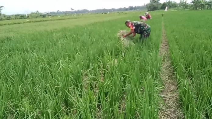 Lumajang, Dalam upaya mendukung ketahanan pangan di wilayah binaannya, Babinsa Koramil 0821-10/Tempeh, Serma Agus Rozak, turut membantu proses penyiangan lahan padi seluas 0,028 Ha milik Sumarno, anggota Kelompok Tani Eka Tani 1 Dusun Sumber Rejo RT 001 RW 004, Desa Kaliwungu, Kecamatan Yosowilangun, Kabupaten Lumajang, Jawa Timur, pada Minggu (16/3/2025).