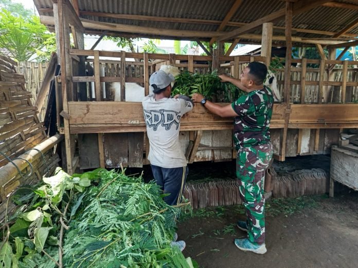 Lumajang, TMMD ke-123, Di sela-sela kesibukan dalam program renovasi Rumah Tidak Layak Huni (RTLH), personel Satuan Setingkat Kompi (SSK) TNI Manunggal Membangun Desa (TMMD) ke-123 menunjukkan kepedulian terhadap warga dengan membantu memberi makan ternak kambing milik Bapak Mega, warga Dusun Mlambing, Desa Burno, Kecamatan Senduro, Lumajang, Jumat (21/2/2025).