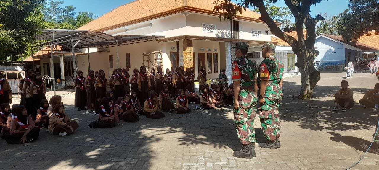 Lumajang, Dalam rangka membentuk kedisiplinan dan jiwa nasionalisme sejak dini, Babinsa Wates Kulon Koramil 0821-06/Ranuyoso, Koptu Sudarmono, memberikan materi latihan Peraturan Baris Berbaris (PBB) kepada siswa-siswi baru Madrasah Aliyah (MA) Roudlatus Syarifah Desa Wates Kulon, Kecamatan Ranuyoso, Kabupaten Lumajang, Jawa Timur, Kamis (18/7/2025).