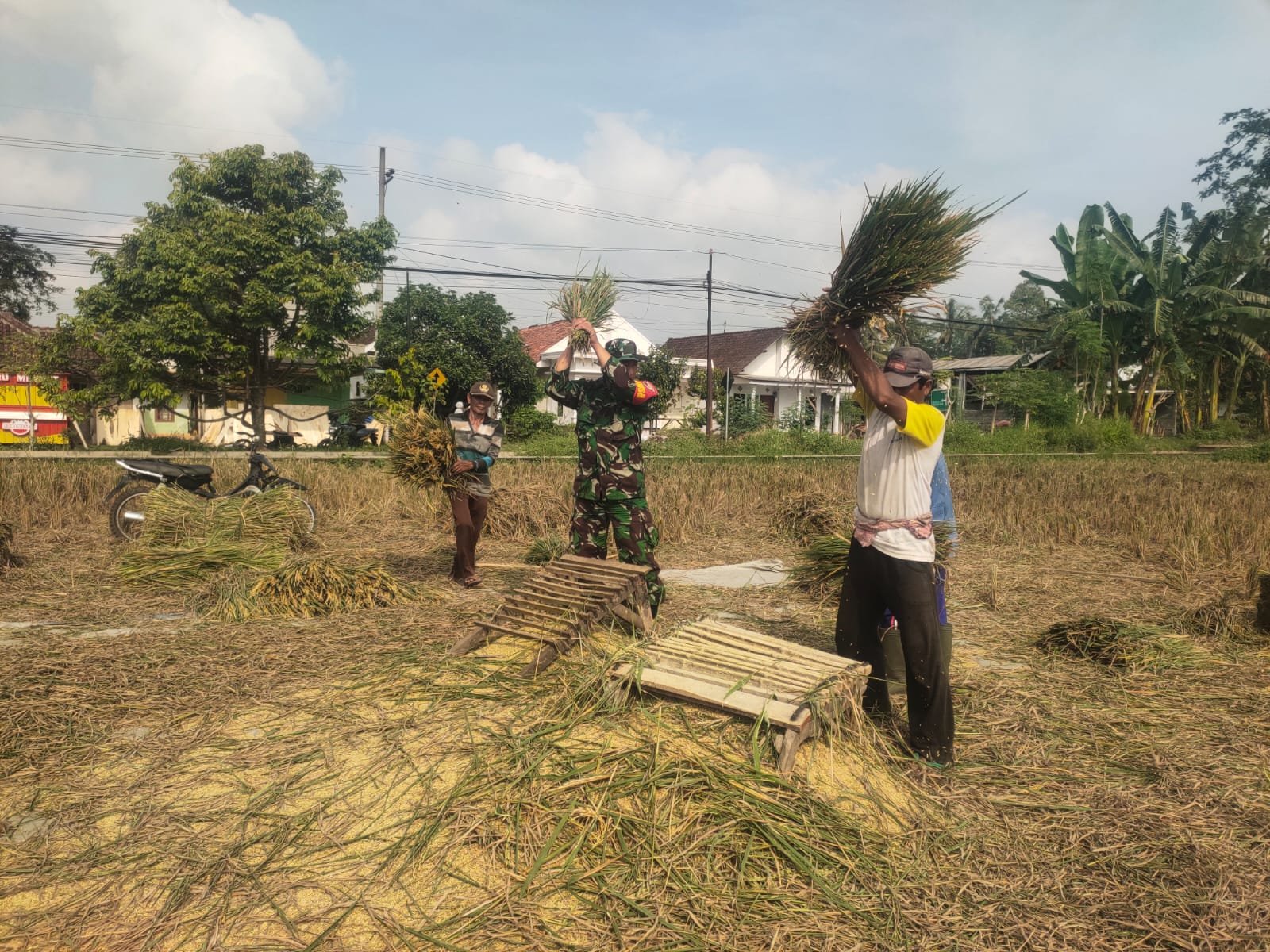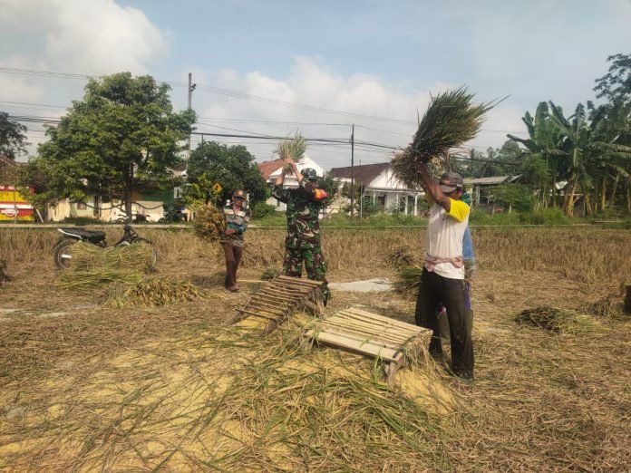 Dorong Peningkatan Ketahanan Pangan Lokal, Babinsa Sarikemuning Mendampingi Petani dalam Panen Padi