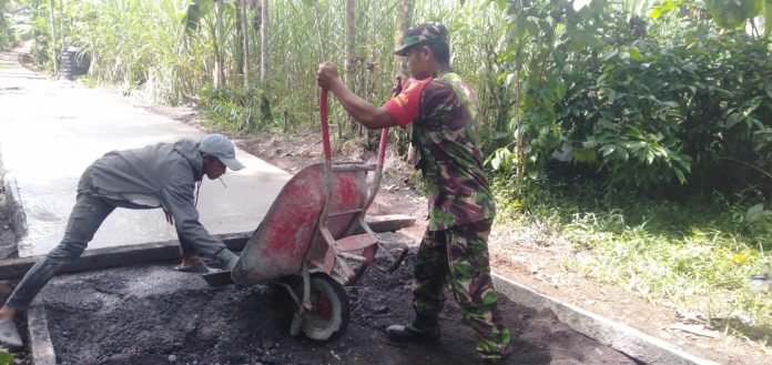 Lumajang, Dalam upaya meningkatkan infrastruktur desa, Babinsa Kenongo Koramil 0821-04/Gucialit, Serda Herman, melaksanakan pendampingan kegiatan karya bakti pengecoran jalan rabat beton di Dusun Margodadi RT 002 RW 004, Desa Kenongo, Kecamatan Gucialit, Kabupaten Lumajang, pada Minggu (9/2/2025).