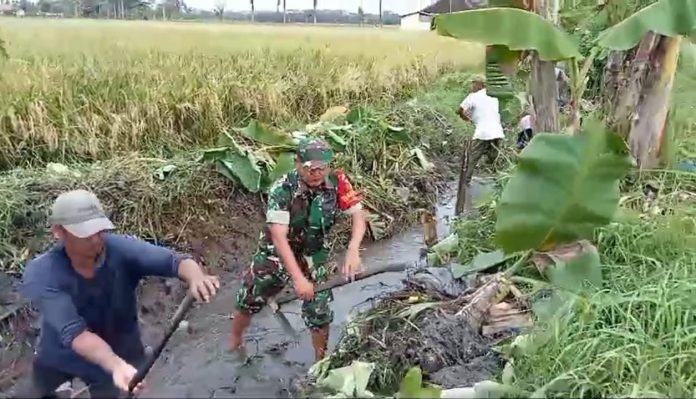 Lumajang, Dalam upaya meningkatkan kelancaran pengairan sawah, Babinsa Rogotrunan Koramil 0821-01/Lumajang, Sertu Joko Tulup, bersama Kelompok Tani (Poktan) Suko Tani I, melaksanakan kegiatan normalisasi saluran irigasi di Sungai Rogotrunan-Boreng RW 010, Kelurahan Rogotrunan, Kabupaten Lumajang, Jawa Timur, pada Sabtu (22/3/2025).