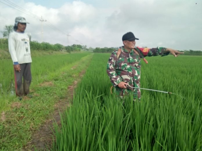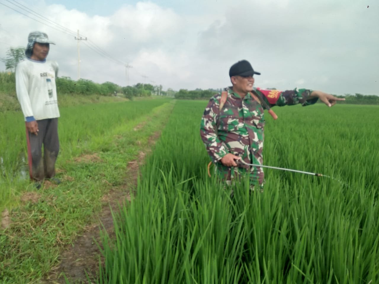 Dukung Swasembada Pangan Lokal, Babinsa Dampingi Penyemprotan Hama di Lahan Petani Desa Kalidilem