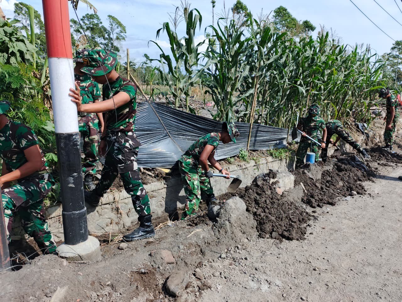 Dalam gambar tampak para prajurit bekerja secara serempak, menggali dan membersihkan tumpukan tanah serta material yang menutup aliran irigasi. Dengan peralatan manual seperti cangkul dan sekop, para anggota TNI terus bergerak cepat memperbaiki jalur air yang selama ini menjadi penopang utama bagi tanaman jagung warga setempat.