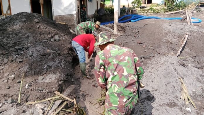 Gerak Cepat TNI, Bati Tuud Koramil Candipuro Pimpin Pembersihan Rumah Warga Terdampak Lahar Dingin