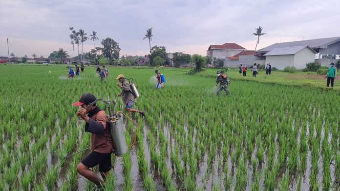 Lumajang, Dalam upaya mengendalikan hama penggerek batang yang mengancam tanaman padi, Babinsa Dawuhan Lor Kulon Koramil 0821-02/Sukodono, Serka Heri Lesmono, bersama Koordinator Pengendali Organisme Pengganggu Tumbuhan (POPT) melaksanakan penyemprotan serentak di lahan seluas 25 hektar milik kelompok tani (Poktan) Tani Makmur, Desa Dawuhan Lor, Kecamatan Sukodono, Kabupaten Lumajang, Jawa Timur, pada Minggu (7/12/2024).