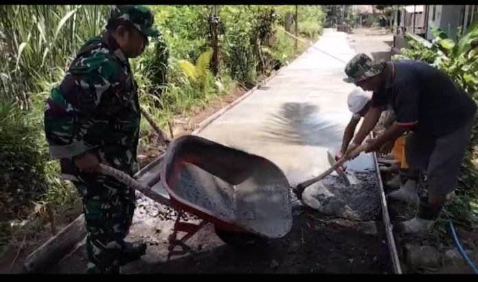Lumajang, Babinsa Madurejo Koramil 0821/08 Pasirian Sertu Rohim melaksanakan giat Karya Bakti pengecoran jalan sepanjang 250 meter di jalan Dusun Dompyong RT 008 RW 003 Desa Madurejo Kecamatan Pasirian Kabupaten Lumajang, Jawa Timur, Sabtu (10/2/2024)