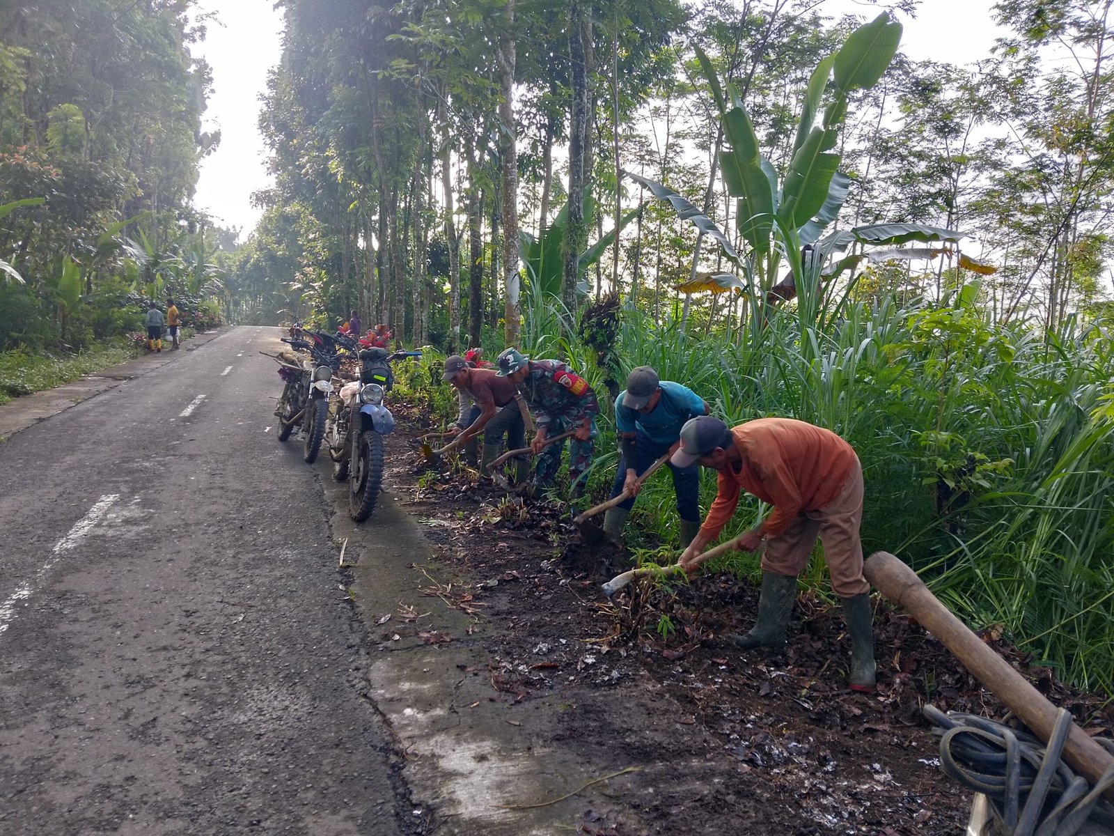 Sejak pagi, suara gotong royong menggema di sepanjang jalan desa. Puluhan warga bersama aparat Babinsa bergotong royong membersihkan ranting, sampah yang menyumbat saluran air, serta memperbaiki kondisi jalan yang mulai tertutup lumpur dan daun kering.