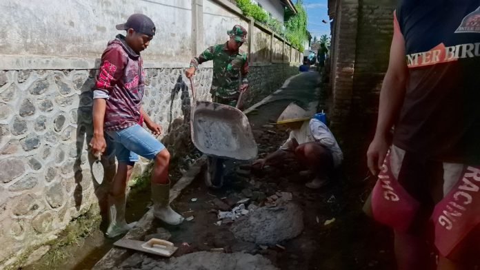 Lumajang,  Babinsa Kloposawit Koramil 0821-09/Candipuro, Serda Moch. Dedik Indra Irawan, bersama warga setempat melaksanakan kerja bakti pengecoran jalan/gang sepanjang 650 meter di Dusun Selorejo RT 003 RW 010, Desa Kloposawit, Kecamatan Candipuro, Kabupaten Lumajang, Jawa Timur, pada Sabtu (1/2/2025).
