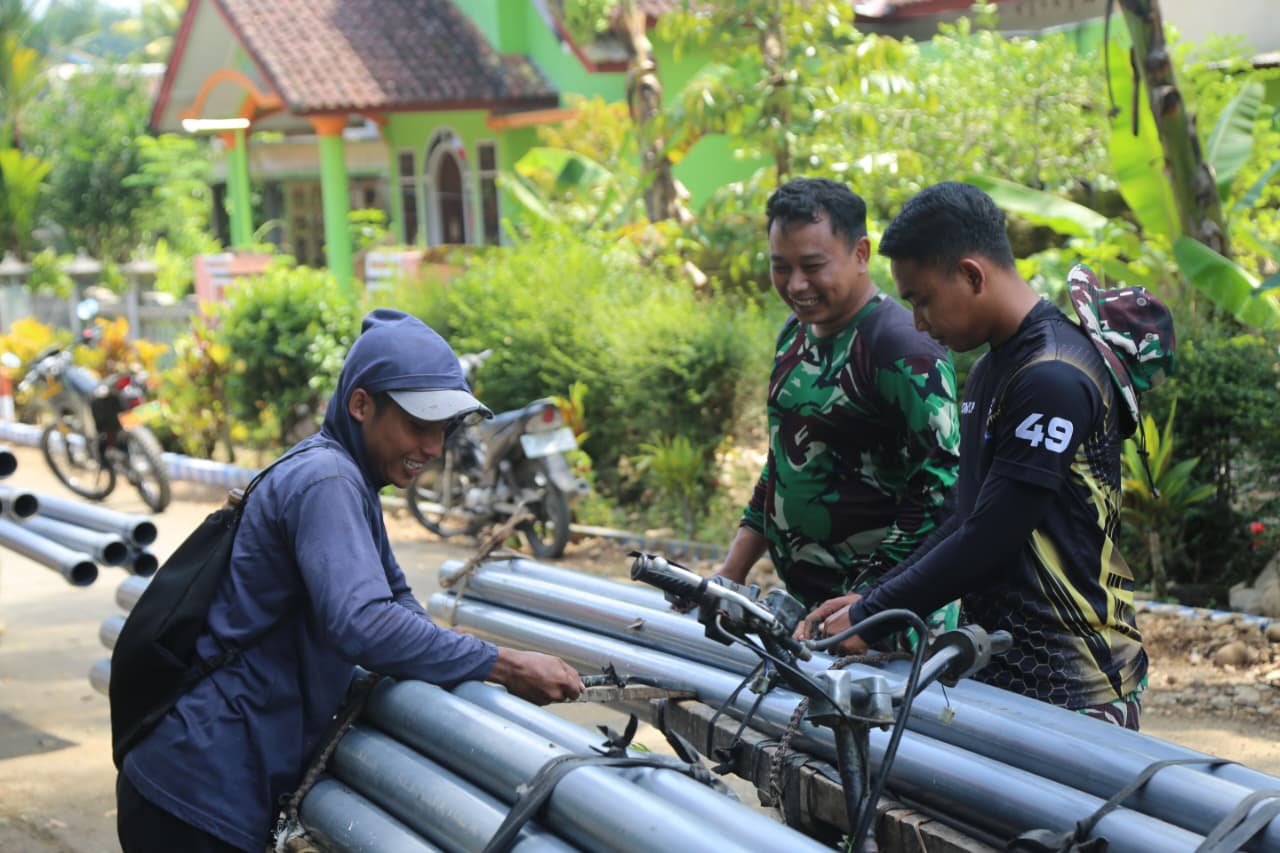 Dengan penuh kehati-hatian, Praka Dion bersama warga mengikat tumpukan pipa menggunakan karet ban dalam agar tidak terjatuh selama proses pengangkutan ke titik pekerjaan. Kegiatan sederhana namun sarat makna ini mencerminkan sinergi dan gotong royong antara TNI dan rakyat dalam membangun desa.