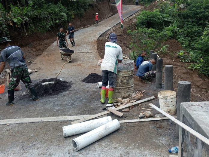 Lumajang, TMMD ke-123, Satgas TNI Manunggal Membangun Desa (TMMD) ke-123 Kodim 0821/Lumajang terus menunjukkan komitmennya dalam membantu pembangunan infrastruktur desa. Sebanyak lima personel Satgas yang dipimpin oleh Pratu Kurniawan bersama warga bergotong royong membangun pagar jalan di Dusun Tugu, Desa Burno, Sabtu (1/3/2025)