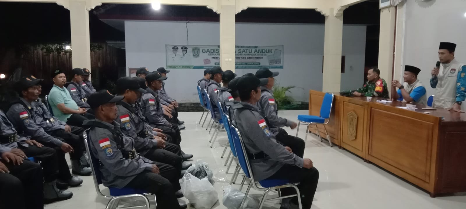 Lumajang, Menjelang pelaksanaan Pemilihan Umum (Pemilu) serentak 2024, Babinsa Banjarwaru Koramil 0821/01 Lumajang melaksanakan pembinaan terhadap anggota Satuan Perlindungan Masyarakat (Satlinmas), yang bertempat di Balai Kantor Kepala Desa Banjarwaru Kecamatan Lumajang Kabupaten Lumajang, Jawa Timur, Senin (5/2/2024).