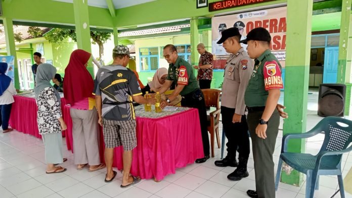 Lumajang, Menjelang Hari Besar Keagamaan Nasional, khususnya bulan suci Ramadan, Babinsa Jogotrunan Koramil 0821-01/Lumajang, Serka Darsono, turut serta dalam pengawalan operasi pasar yang digelar di Balai Kelurahan Jogotrunan, Kecamatan Lumajang, Kabupaten Lumajang, Jawa Timur, pada Jumat (28/2/2025).