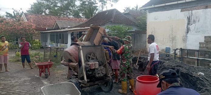Lumajang, Sebagai komitmennya dalam mendukung pembangunan infrastruktur desa, Babinsa Pasirian Koramil 0821/08 Pasirian, Serka Nanang Dwi Sudjarwadi, melaksanakan pendampingan dalam karya bakti pengecoran jalan, sepanjang 300 meter di Dusun Joho RT 001 RW 002, Desa Pasirian Kecamatan Pasirian Kabupaten Lumajang Jawa Timur, pada Selasa (8/10/2024).