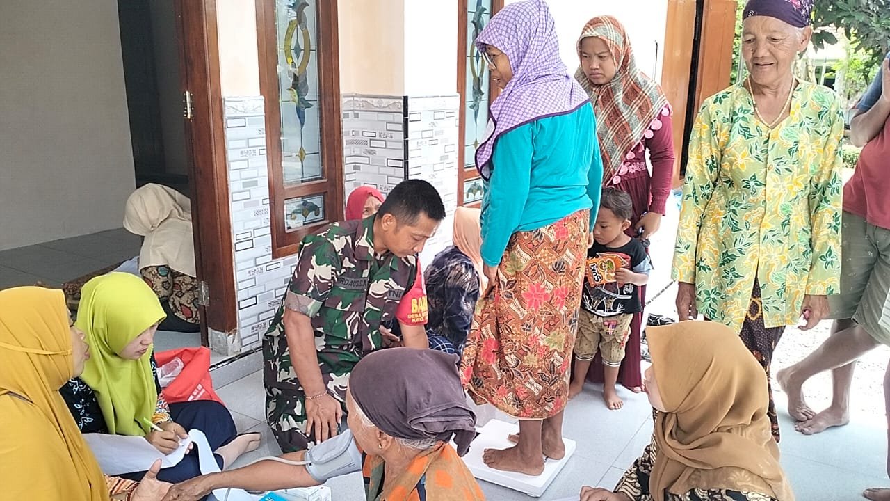 Lumajang, Dalam rangka meningkatkan pelayanan kesehatan masyarakat, Babinsa Selok Anyar Koramil 0821-08/Pasirian, Sertu Firdaus Dardhiansyah, mendampingi kegiatan Posyandu Lansia di Posyandu Anggrek, Dusun Kalikembar RT 004 RW 002, Desa Selok Anyar, Kecamatan Pasirian, Kabupaten Lumajang, Jawa Timur, pada Selasa (31/12/2024).