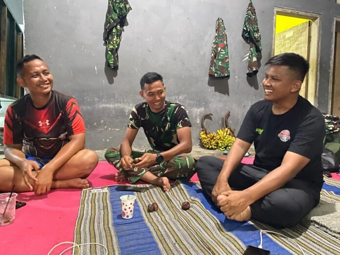 Tak hanya bekerja keras, suasana kebersamaan juga begitu terasa ketika malam tiba. Prajurit dan warga duduk bersama sambil menikmati hidangan sederhana, berbagi cerita, bahkan tertawa bersama seolah tanpa sekat antara TNI dan rakyat.