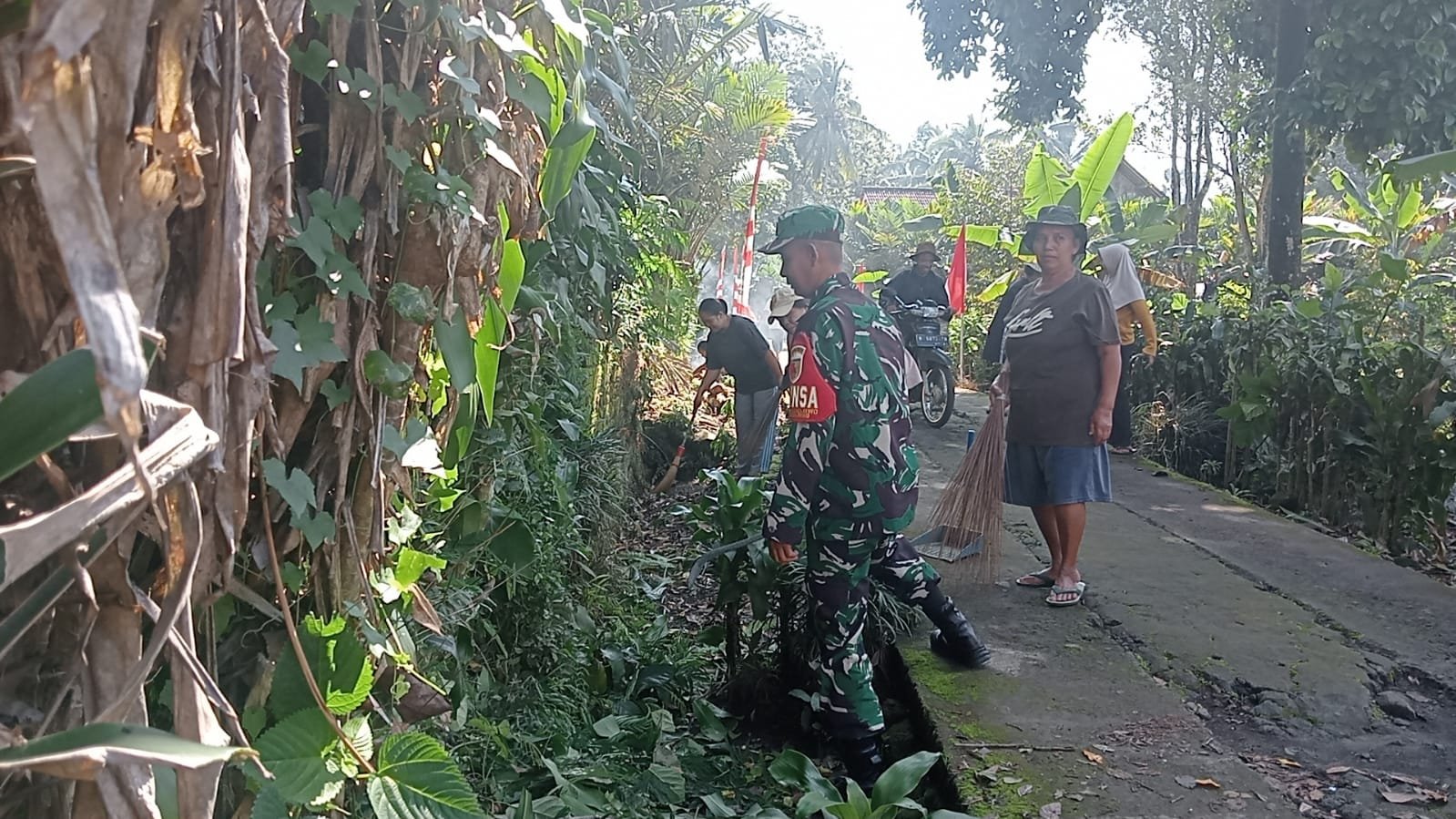 Kegiatan kerja bakti tersebut diikuti oleh puluhan warga dari berbagai lapisan masyarakat, mulai dari perangkat desa, tokoh masyarakat, hingga para pemuda setempat. Mereka secara sukarela turun ke jalan untuk membersihkan sampah, memangkas rumput liar, dan memperlebar jalur yang sempit agar lebih aman dilalui. Jalan penghubung antar RT yang menjadi sasaran pembersihan ini merupakan akses vital bagi warga, baik untuk keperluan ekonomi, pendidikan, maupun aktivitas sehari-hari.