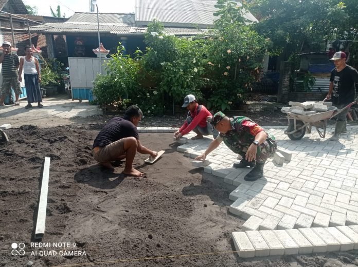 Lumajang, Dalam rangka mendukung program pemerintah desa dan meningkatkan kualitas infrastruktur, Babinsa Kaliboto Lor Koramil 0821/12 Jatiroto, Serda Syafiudin, turun langsung memantau kegiatan pemasangan paving blok di Dusun Persil Nyeoran, Desa Kaliboto Lor, Kecamatan Jatiroto, Kabupaten Lumajang, Jawa Timur, pada Minggu (28/7/2024).