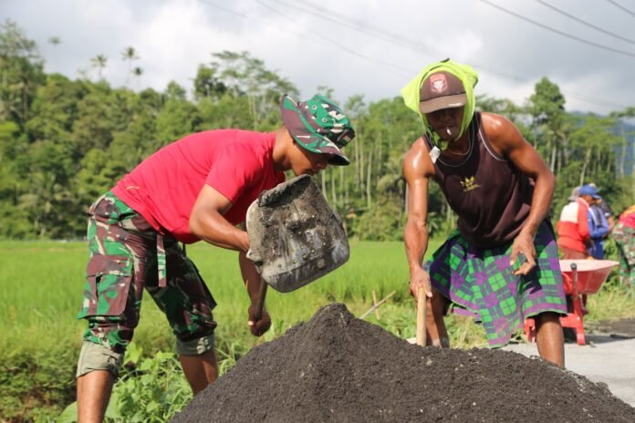Di lapangan, terlihat sinergi yang solid antara prajurit dan masyarakat. Mereka bekerja bergantian, ada yang mengaduk semen, menata batu, dan ada pula yang mengangkut bahan material. Tawa kecil di sela kerja keras menjadi penguat semangat kebersamaan mereka.