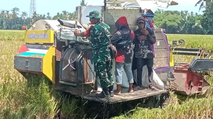 Lumajang, Dalam rangka mendukung program ketahanan pangan nasional, Babinsa Sukosari Koramil 0821/12 Jatiroto, Serka Samsuliadi Dwi Purwanto bersama anggota melaksanakan pendampingan panen padi milik Kelompok Tani (Poktan) Tani Jaya yang berlokasi di Dusun Rowokul, Desa Sukosari, Kecamatan Jatiroto, Kabupaten Lumajang, Jawa Timur, Kamis (17/4/2025).