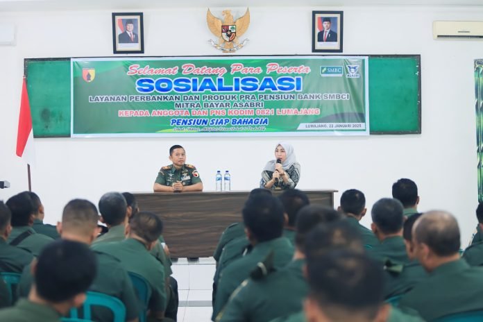 Lumajang, Dalam rangka memberikan pemahaman mendalam mengenai layanan perbankan dan produk pra pensiun, Kodim 0821/Lumajang menggelar sosialisasi yang dihadiri oleh anggota TNI dan PNS calon pensiunan Kodim 0821 Lumajang, bertempat di Aula Raden Wijaya Makodim 0821/Lumajang, Rabu (22/1/2025).