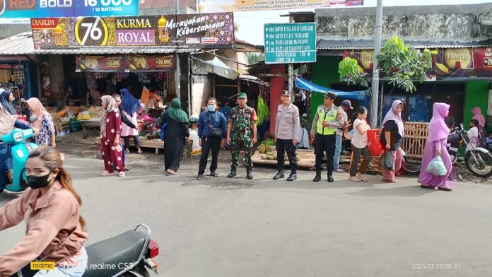 Lumajang, Dalam rangka menjaga situasi keamanan dan ketertiban masyarakat (Kamtibmas) menjelang Hari Raya Idul Fitri, Babinsa Pasrujambe Koramil 0821-17/Pasrujambe, Serda Amil Fahrudin, bersama Bhabinkamtibmas melaksanakan pemantauan serta pengamanan di Pasar Tradisional Dusun Krajan, Desa Pasrujambe, Kecamatan Pasrujambe, Kabupaten Lumajang, Jawa Timur, pada Minggu (30/3/2025).