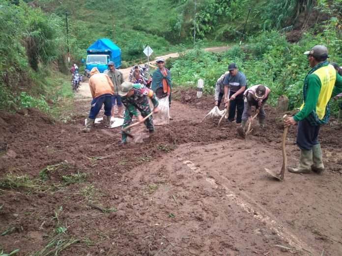 Kolaborasi TNI-Polri Bersama Warga Bersihkan Tanah Longsor di Jalan Argosari