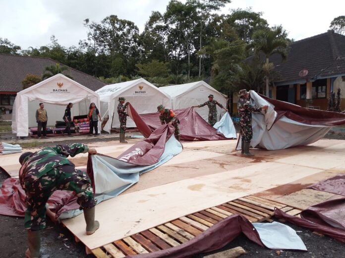 Lumajang — Upaya meningkatkan kenyamanan dan keteraturan di lokasi pengungsian terus dilakukan oleh jajaran TNI bersama relawan. Sebagai koordinator pengungsian di SMPN 02 Pronojiwo, Danramil 07/Randuagung, Kapten Inf Erwin Daud, S.Pd, memimpin langsung kegiatan bongkar pasang dan penataan ulang tenda pengungsi agar lokasi lebih tertata dan siap menerima bantuan.
