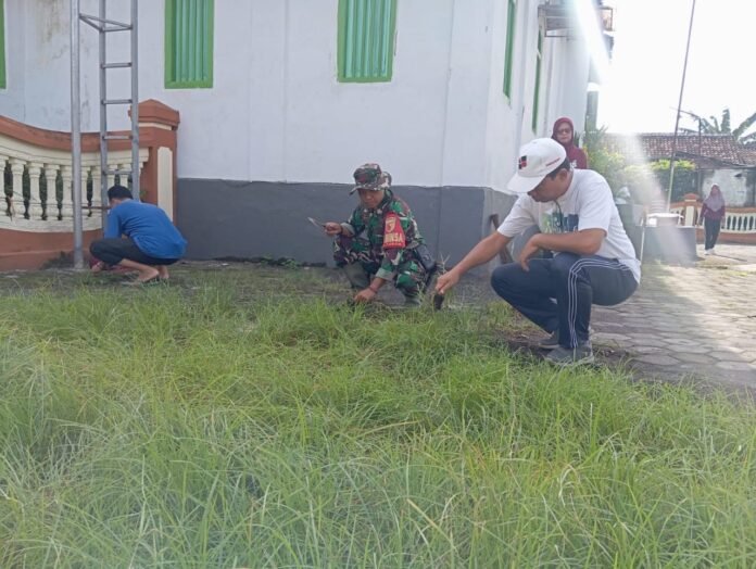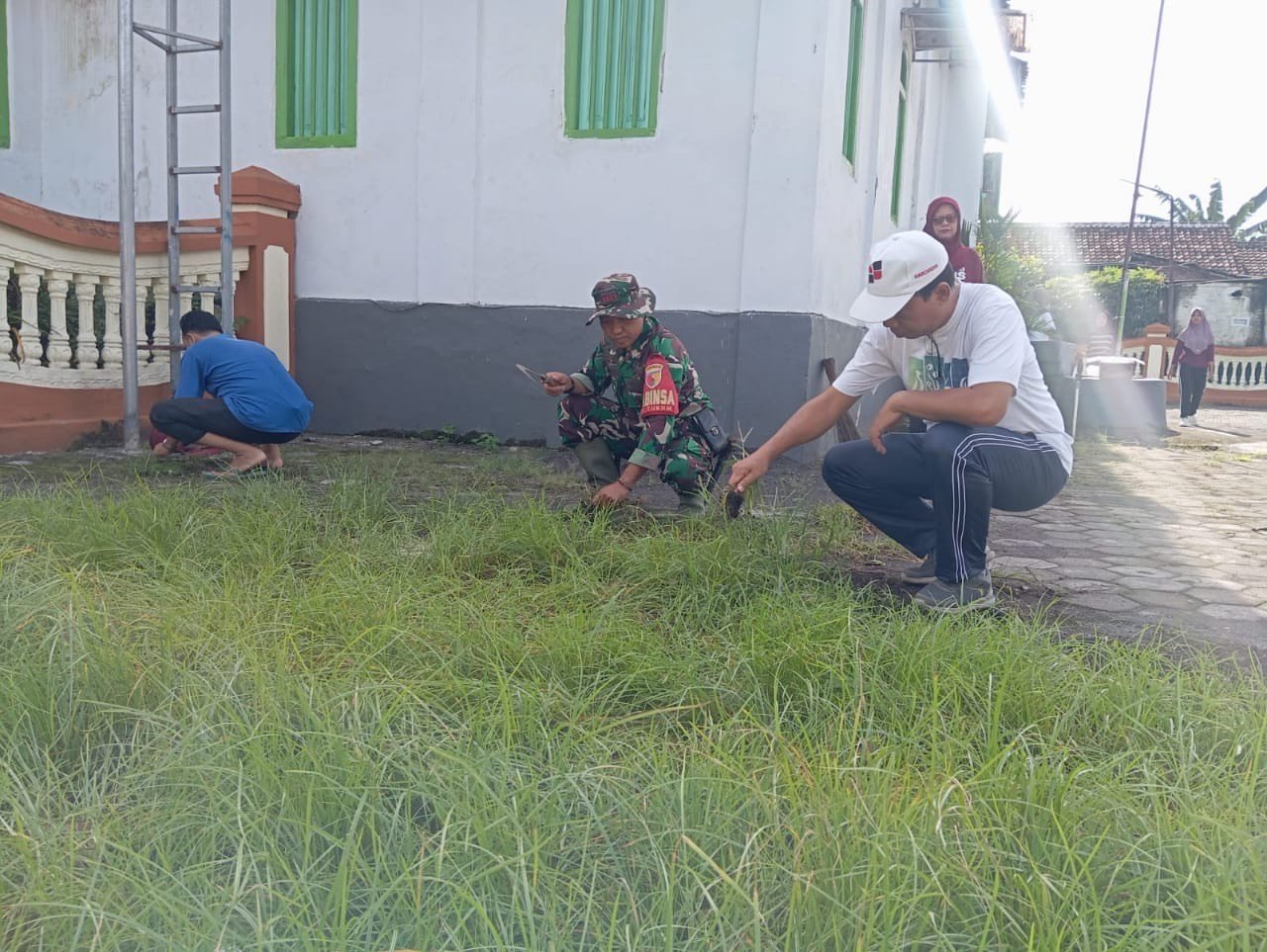 Maknai Isra’ Mi’raj, Babinsa Tukum Bersama Pemdes dan Warga Gelar Kerja Bakti di Masjid Baiturrohman