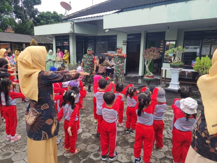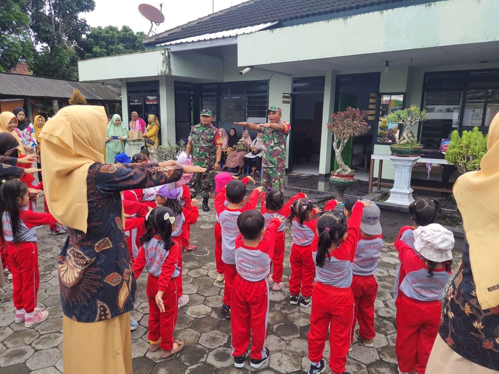 Lumajang, Babinsa Dawuhan Lor Koramil 0821-02/Sukodono Serka Heri Lesmono, sambut kedatangan anak didik Paud KB Dewi Sartika Klanting, di Makoramil 0821-02/Sukodono Kabupaten Lumajang Jawa Timur, pada Sabtu (8/2/2025).