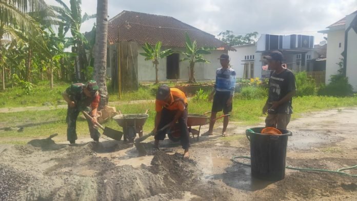 Lumajang, Upaya menjaga fasilitas umum untuk jangka panjang, Babinsa Kaliboto Lor Koramil 0821/12 Jatiroto Serda Syafiudin, bersama warga melaksanakan kerja bakti perbaikan jalan di Dusun Krajan 2 RT 031 RW 006 Desa Kaliboto Lor Kecamatan Jatiroto Kabupaten Lumajang, Jawa Timur, Kamis (14/3/2024).